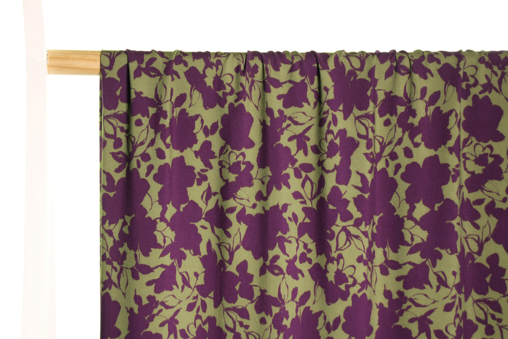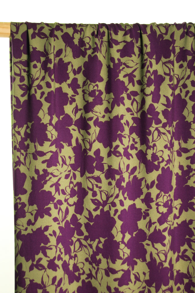A khaki green viscose with purple flowers. This fabric is perfect for blouses, dresses, skirts...
