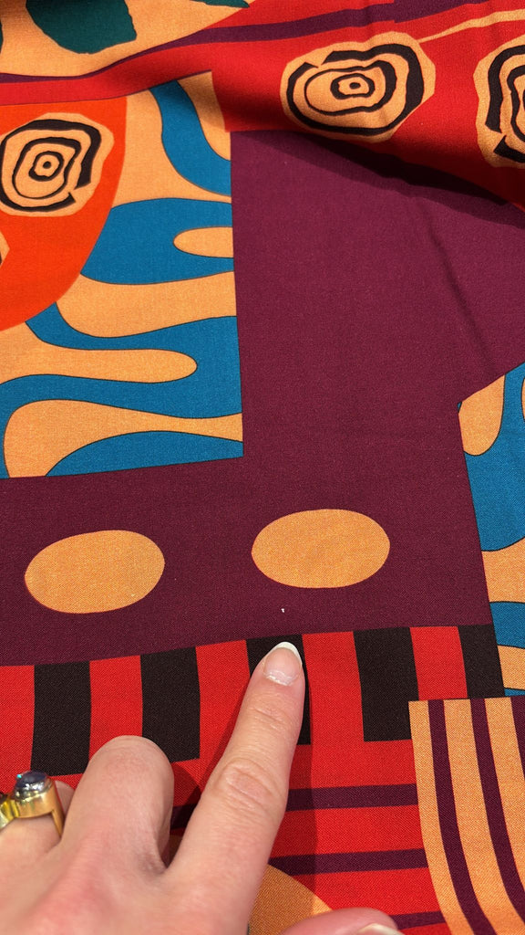 A red coloured viscose with patchwork print. This fabric is perfect for blouses, dresses, skirts...