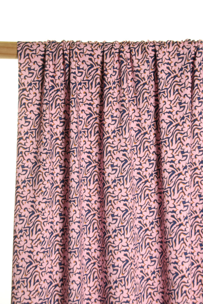 Une viscose rose doux à imprimé floral en blue foncé avec de fines lignes ocre. Ce tissu est parfait pour des blouses, des robes, des jupes, ...