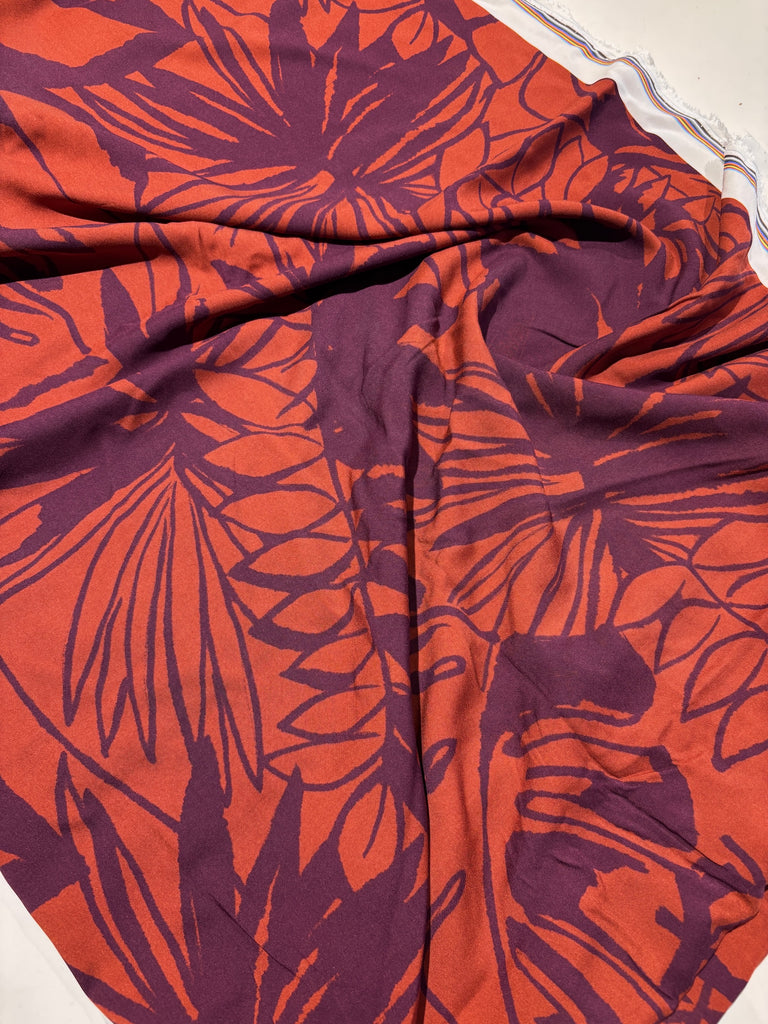 Un viscose brun roux avec imprimé feuilles couleur aubergine. Ce tissu est parfait pour des robes, des jupes, des blouses, ...