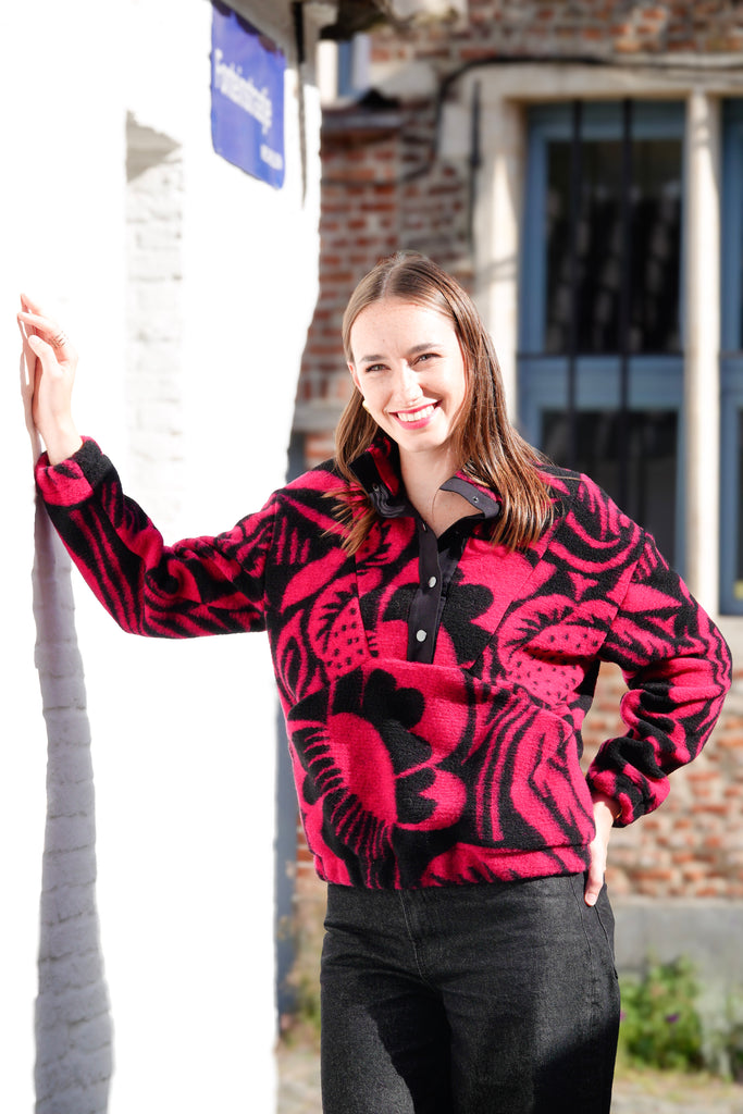 Tissu d’hiver doux, composé d’un mélange de laine et polyester. Le tissu a un imprimé de fleurs abstraites en noir et fuchsia. Il existe aussi deux autres variantes de couleur. Idéal pour des pulls et vestes! Le tissu est tricoté.