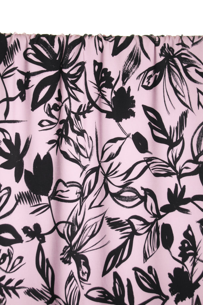 Une viscose lilas à imprimé de fleurs noires peintes. Ce tissu est parfait pour des blouses, des robes, des jupes...