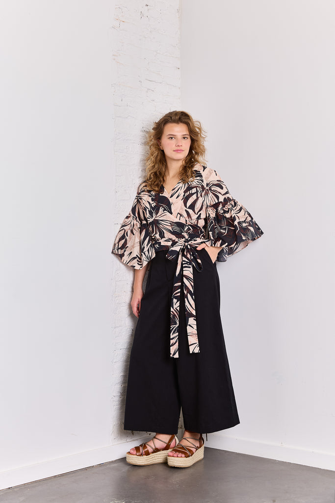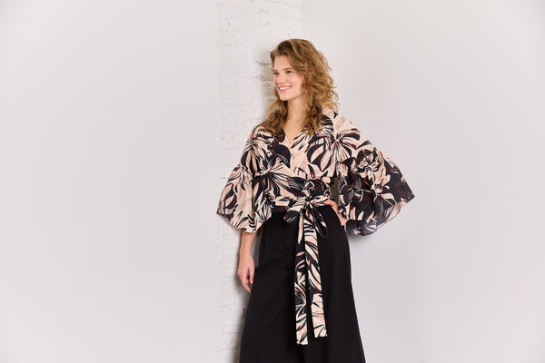Atelier Jupe a réalisé la blouse Trixie dans ce tissu, en version manche froncée et ruban à nouer.