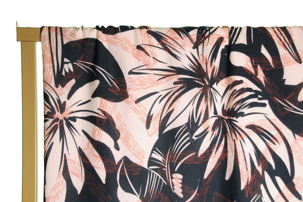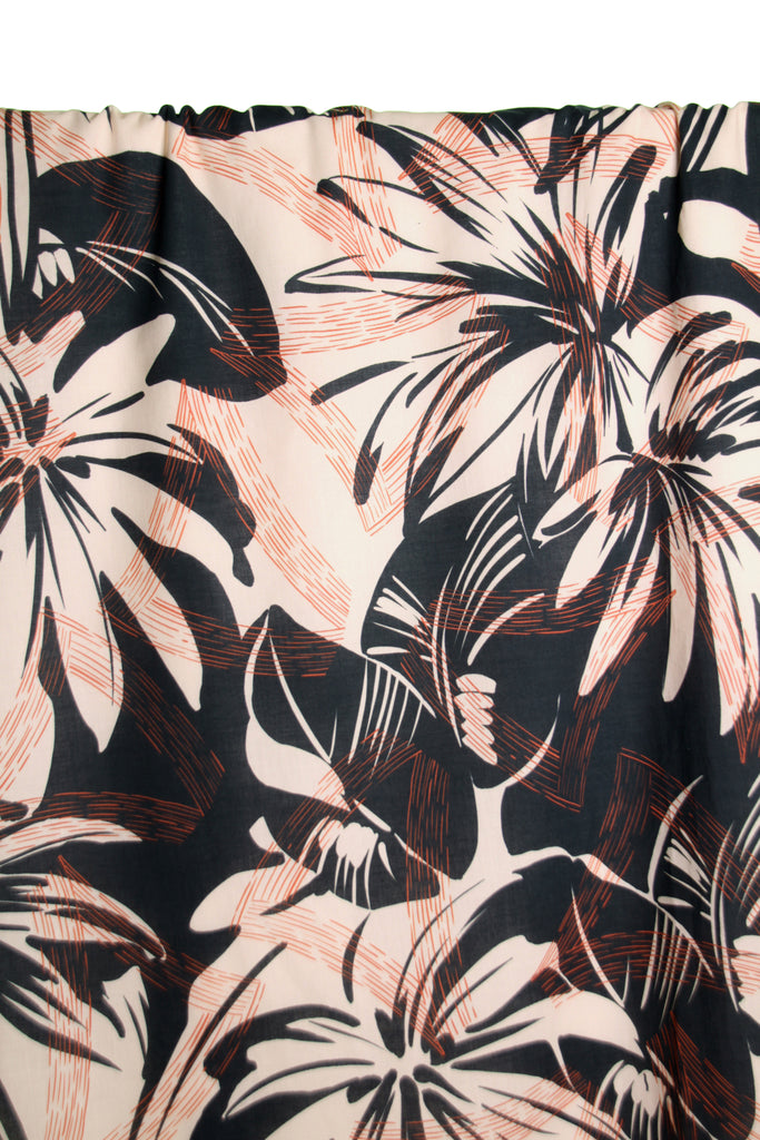 Un coton léger à imprimé feuilles tropicales en noir et beige à detail rouge. Ce tissu est parfait pour des blouses, des robes, des jupes...